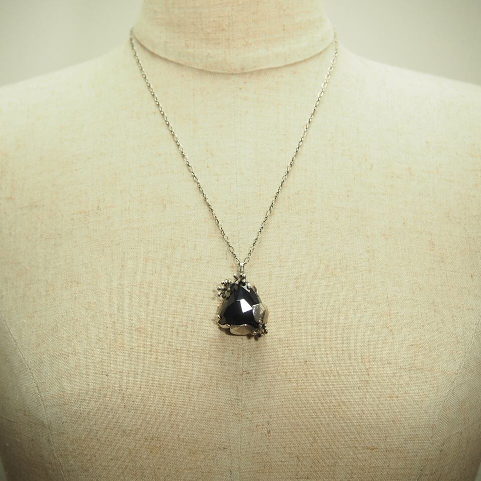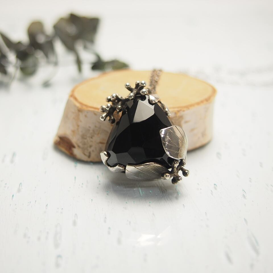 大きなランダムカットの三角オニキスを葉っぱやつぶつぶの実でやさしく包みました。